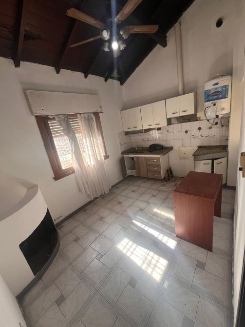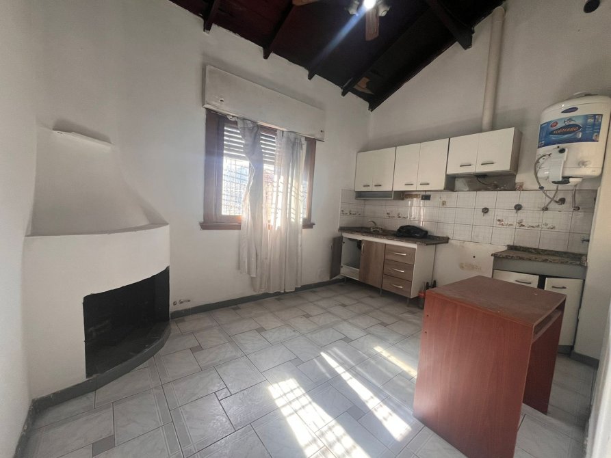 Cocina comedor con bajo mesada y alacena, estufa a gas.