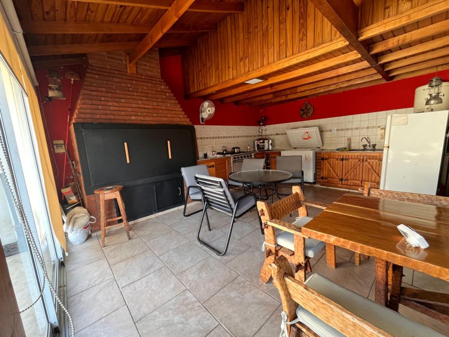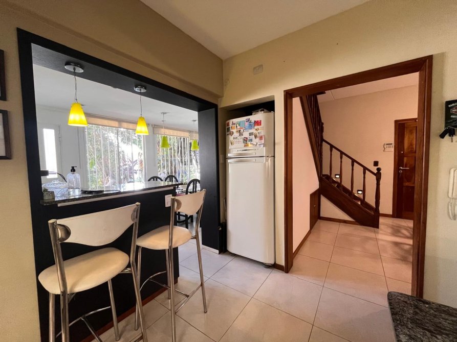 Cocina con bajo mesada y alacena, barra desayunadora y doble comedor diario. Lavadero cubierto.